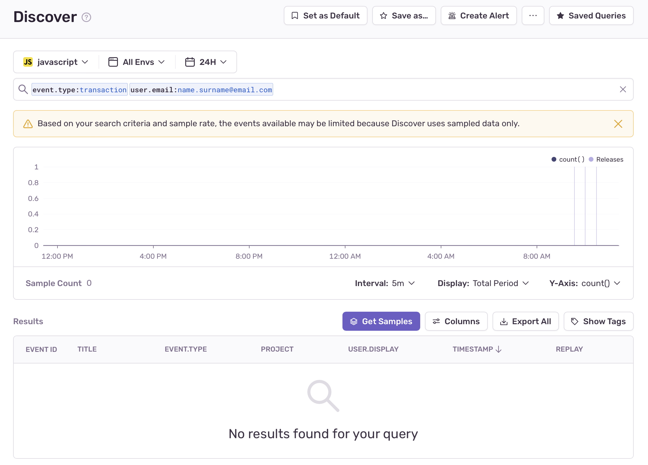 When you query transactions either in Discover or in Transaction Summary and receive fewer than 5 samples, you can click "Get Samples" to create a new investigation rule and retain more samples of transactions for the respective query.