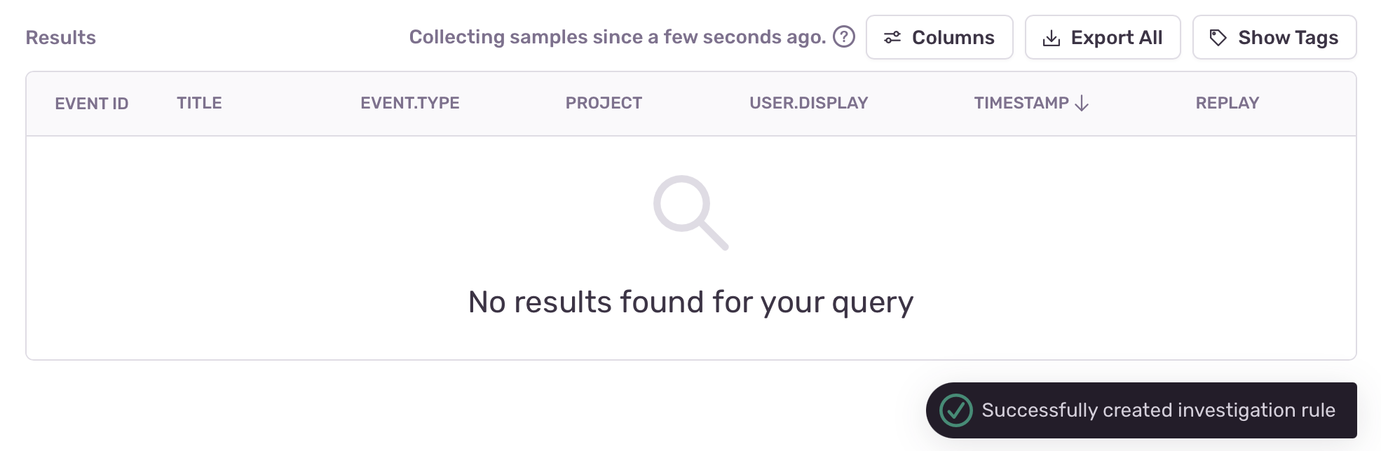 Clicking this button creates an investigation rule for the query. Once the rule is successfully created, a notification appears, and the button is replaced with a message showing the investigation is in progress and the amount of time it's been active.