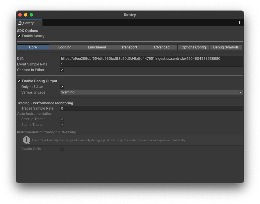 Sentry can be configured via the Sentry configuration window or programatically. The window can be accessed by going to Unity's top menu: Tools