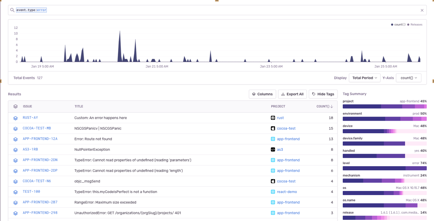You can set up a query in Discover to take a more proactive approach to resolving your busiest issues. When you're building the query, search for event.type:error
