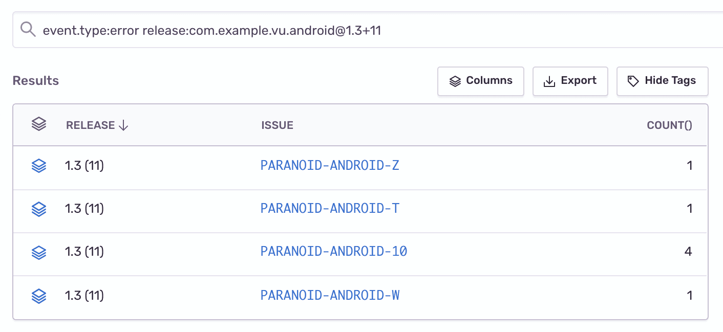 Each table cell has a dynamic context menu that allows you to continue exploring your data by automatically updating the search bar or the table columns, according to your selection. Actions like adding or excluding values from the filter, opening a selected release, or viewing the underlying stack of issues: