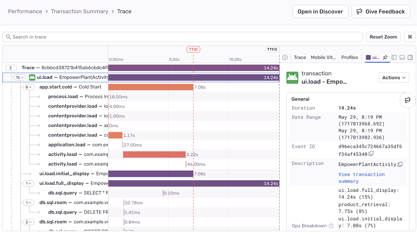 You can see additional information about your event by clicking into any "Event ID" on the Discover page. Clicking on any event type other than an error event, will take you to the Trace View page. Clicking on an error event will take you to the Issues page.