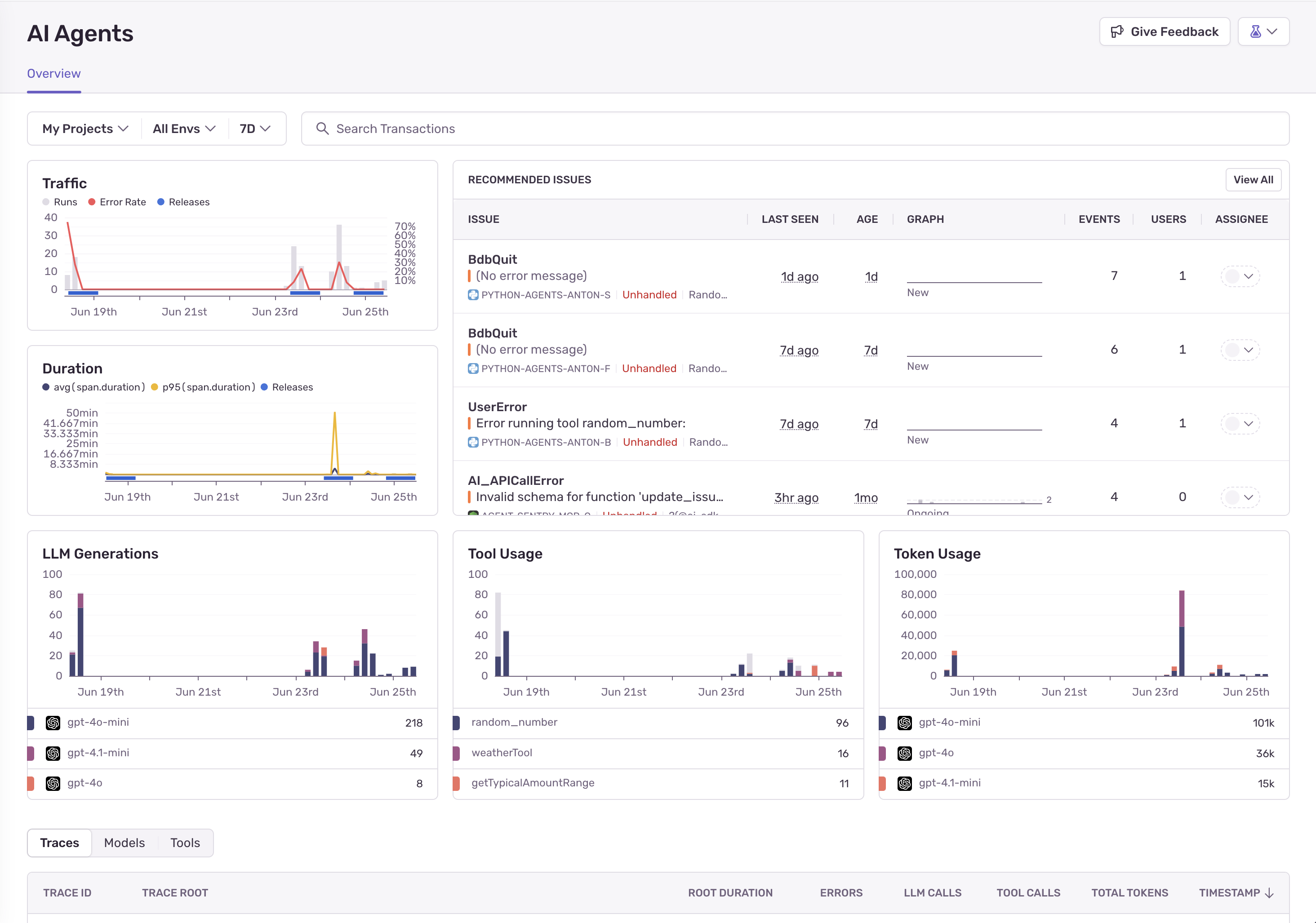 Sentry's AI Agent monitoring tools help you understand what's going on with your AI agent workflows. They automatically collect information about agent runs, tool calls, model interactions, and errors across your entire AI pipeline—from user interaction to final response.