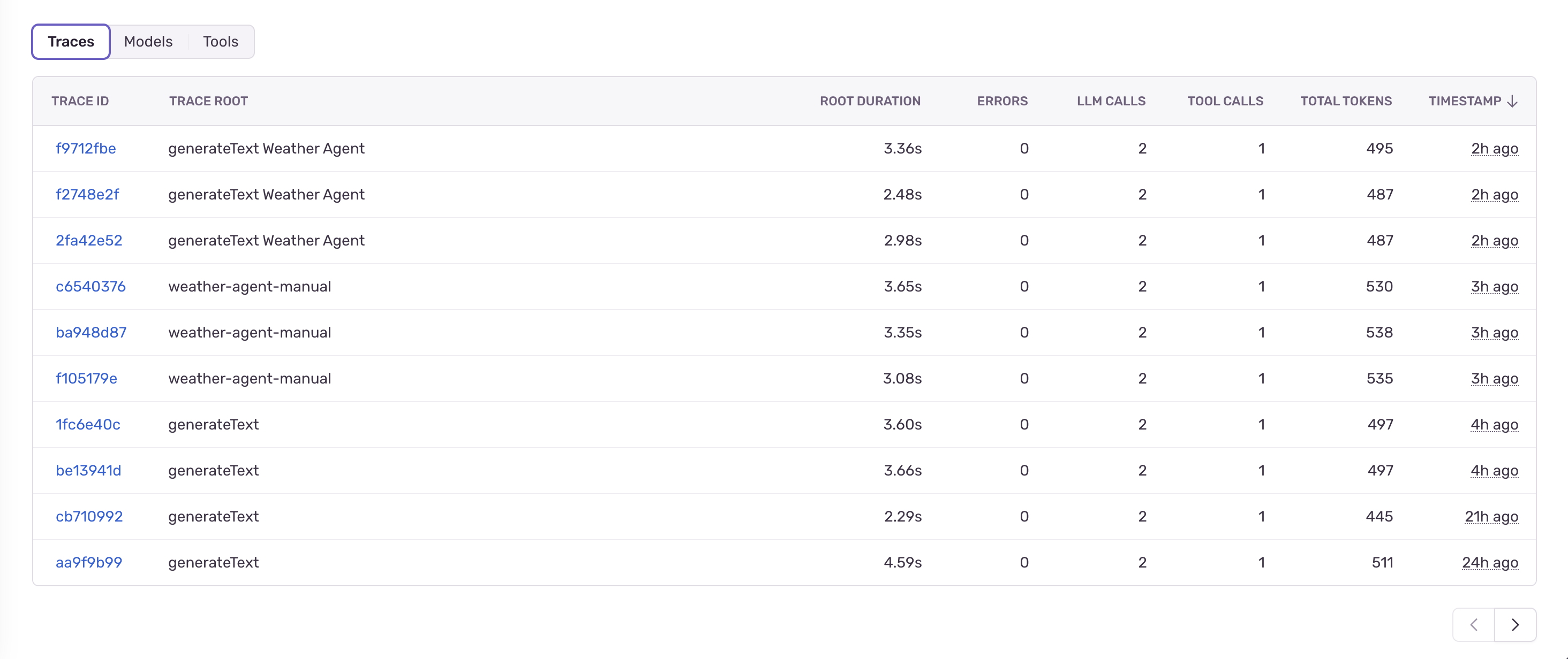 - Traces: Recent agent runs with duration, errors, number of LLM and tool calls and token usage
