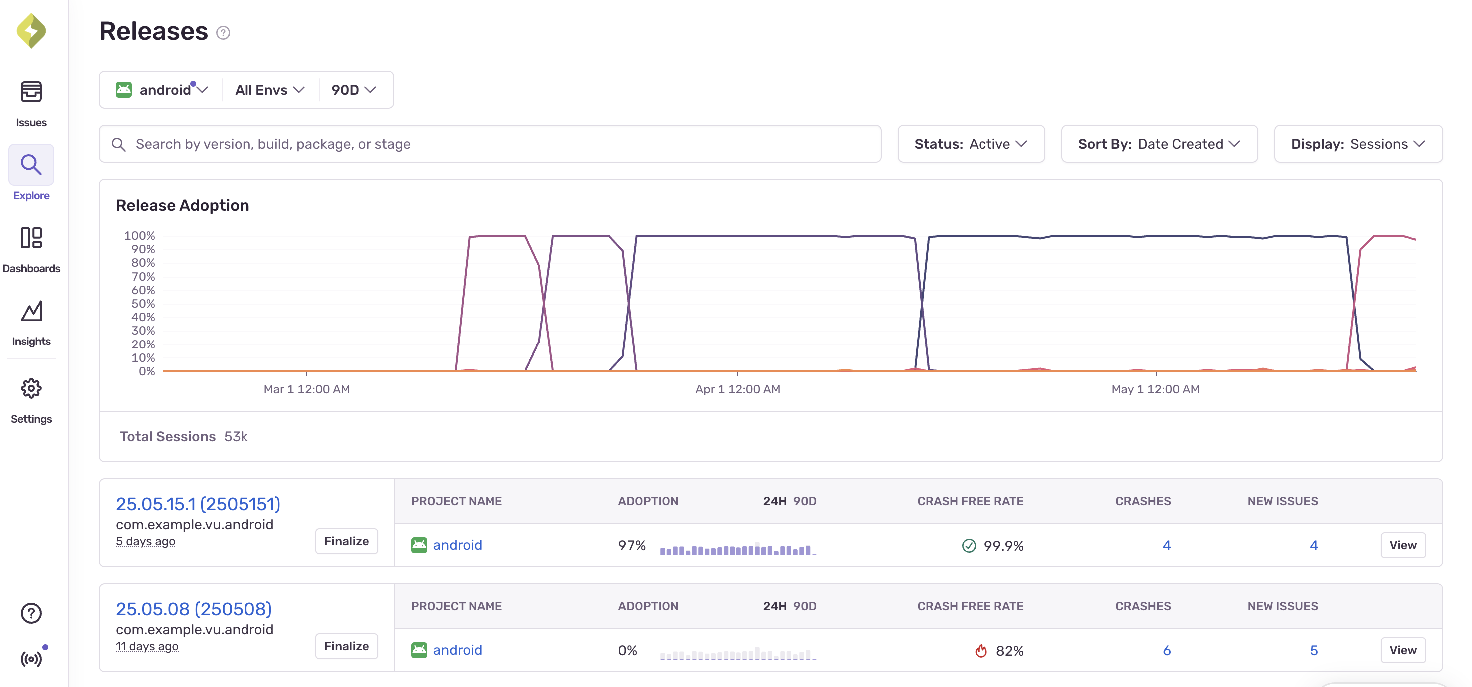 • Adopted - The release's percentage of sessions compared to all sessions is above the threshold. That is, the release was seen in 10% or more of sessions over all releases in the last six hours.