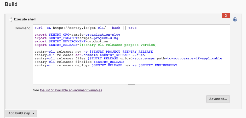 Copiedcurl -sL https://sentry.io/get-cli/ | bash || true export SENTRY_ORG=sample-organization-slug export SENTRY_PROJECT=sample-project-slug export SENTRY_ENVIRONMENT=production export SENTRY_RELEASE=$(sentry-cli releases propose-version) sentry-cli releases new -p $SENTRY_PROJECT $SENTRY_RELEASE sentry-cli releases set-commits $SENTRY_RELEASE --auto sentry-cli sourcemaps upload --release $SENTRY_RELEASE path-to-sourcemaps-if-applicable sentry-cli releases finalize $SENTRY_RELEASE sentry-cli deploys new -e $SENTRY_ENVIRONMENT